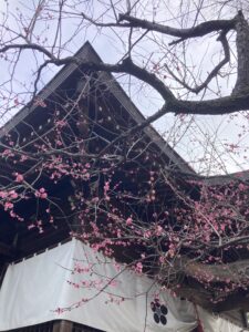 (神社の境内では、梅の花がきれいに咲いていました)